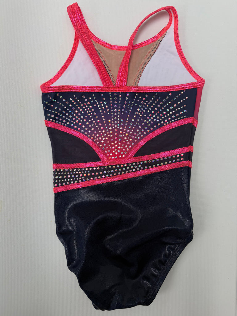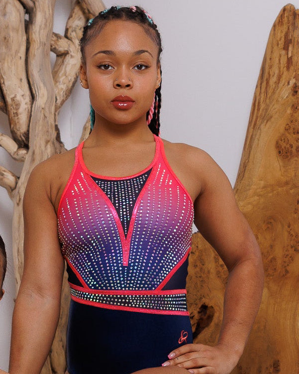 Navy mystique bottom and sparkling crystals, and modern design make this leotard graceful, daring, and unforgettable.