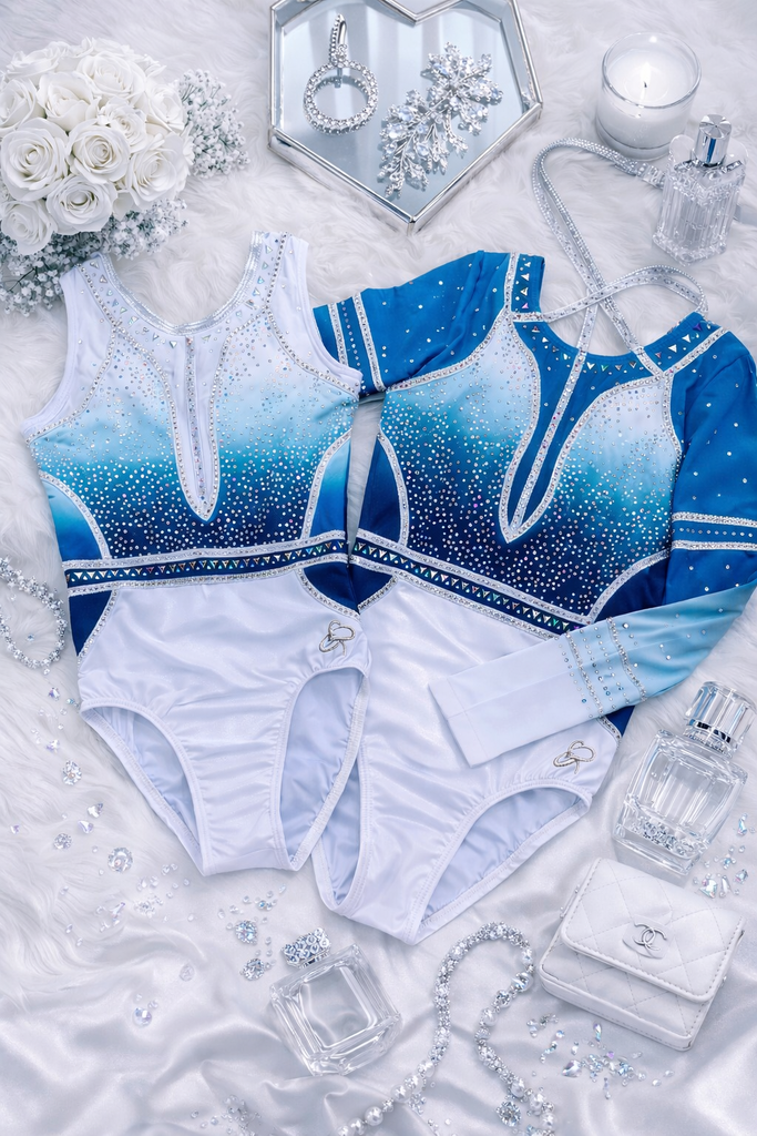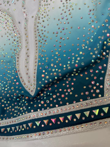 This stunner of a leotard is an absolute show stopper with its pearlescent white mystique bottom, sparkliest of gems and gorgeous blue ombre lycra chest.