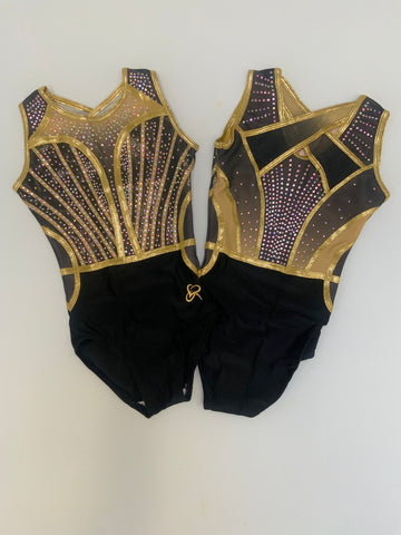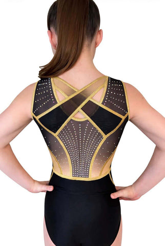 With cascading gems, stunning gold mystique applique and subtle gold sparkle through the mesh chest piece, you will be dressed every bit the royalty you deserve to feel! This leotard doesn't cut any corners with elegance and style, so put this on and arrive knowing you mean business!